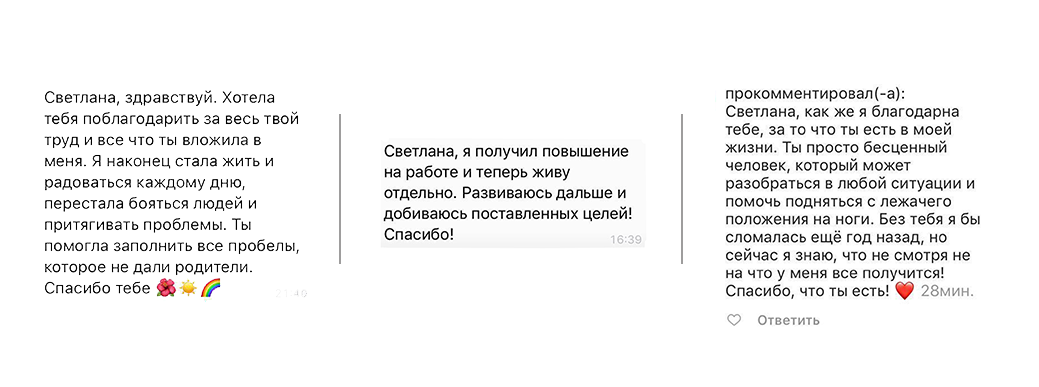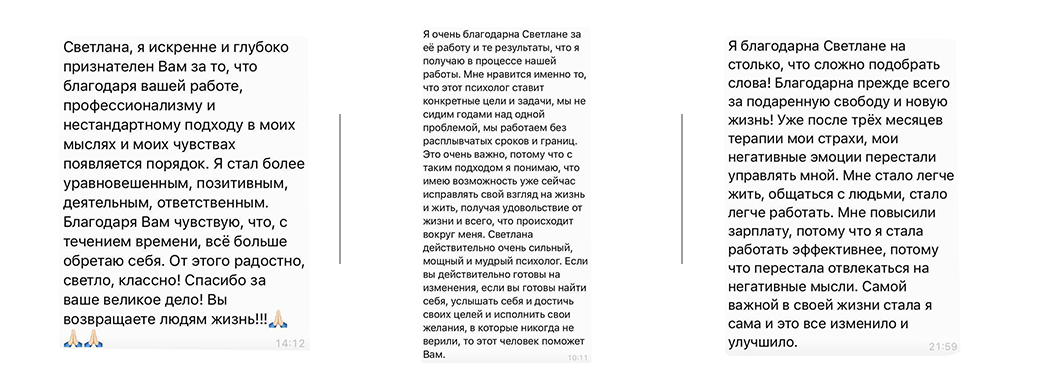 Благодаря полученным знаниям закономерностей эмоционально-телесной зависимости стало возможным достижение положительной динамики в терапии за более короткие сроки. Помогая людям справиться с психологическими проблемами, я полагаюсь на интегративный подход, что позволяет мне использовать наиболее эффективные инструменты современной психотерапии, начиная с психоанализа и заканчивая техниками НЛП.